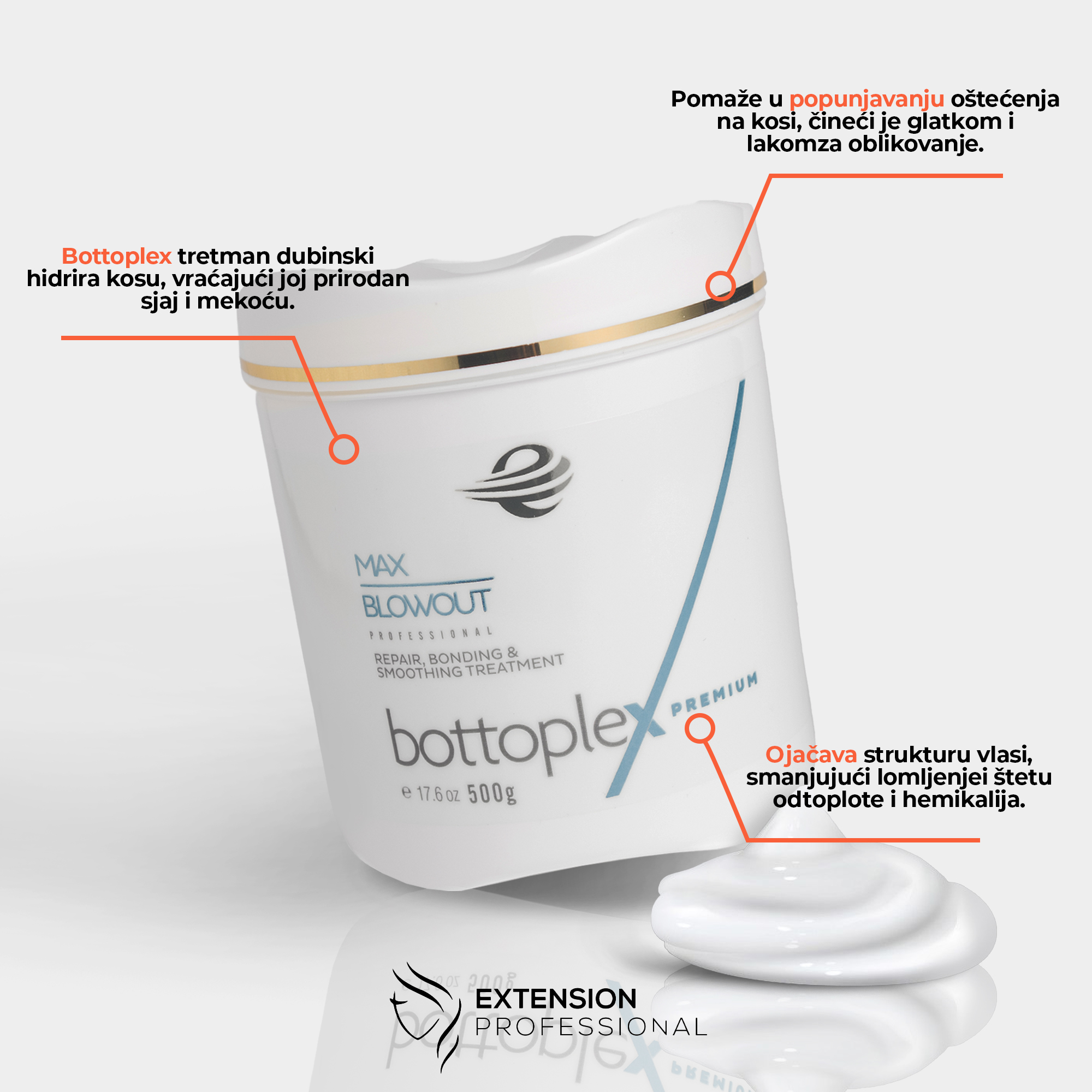 Bottoplex Premium je napredni profesionalni tretman za obnovu, zaglađivanje i jačanje kose, posebno formulisan za kosu koja je oštećena, preopterećena i hemijski tretirana (farbanje, blajhanje, posvetljivanje, pramenovi, toniranje, feniranje i termo-stilizovanje). Namenjen je isključivo radu u salonu i dizajniran da kosi vrati mekoću, sjaj, elastičnost i “zdrav izgled” već nakon prvog tretmana